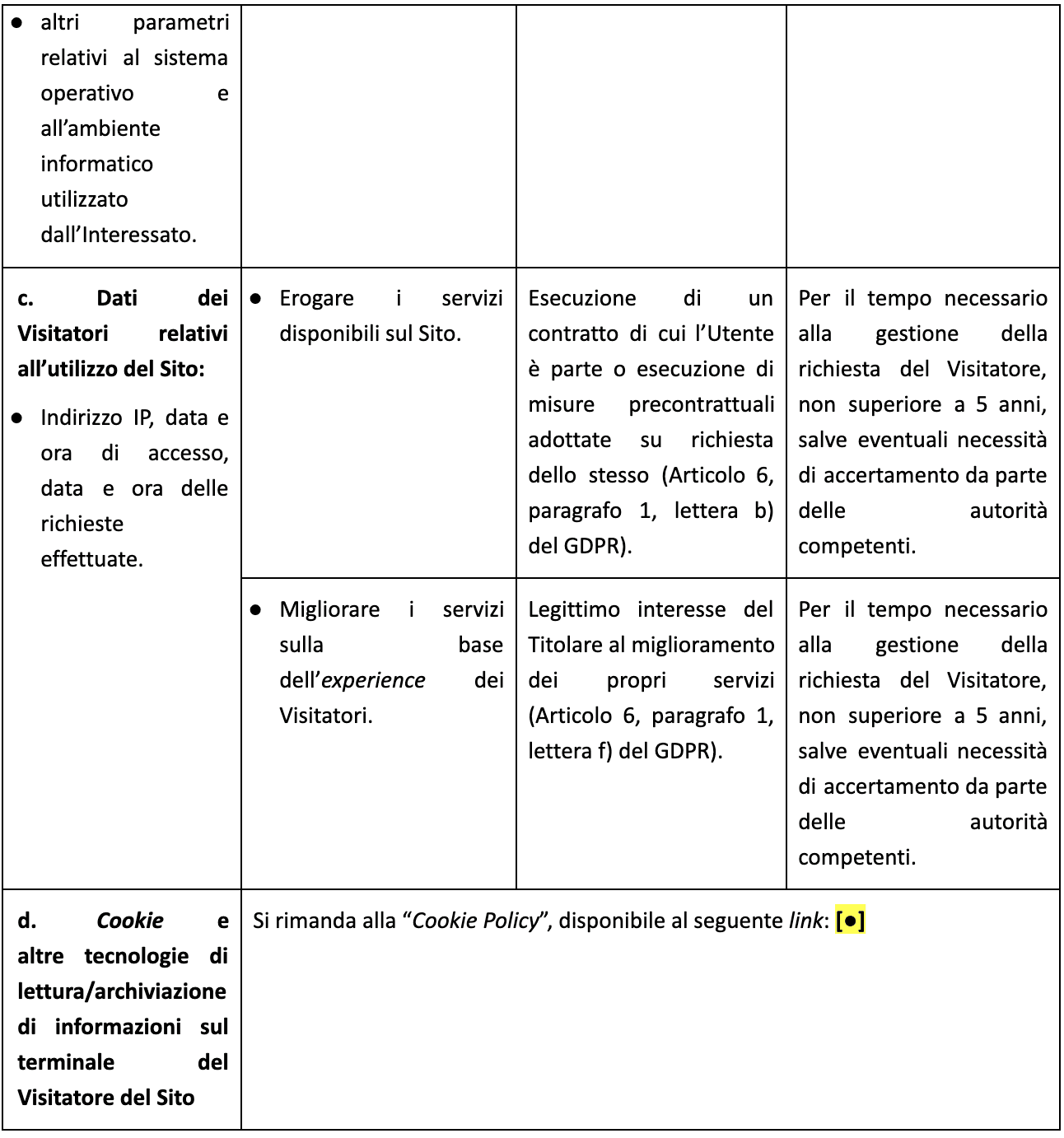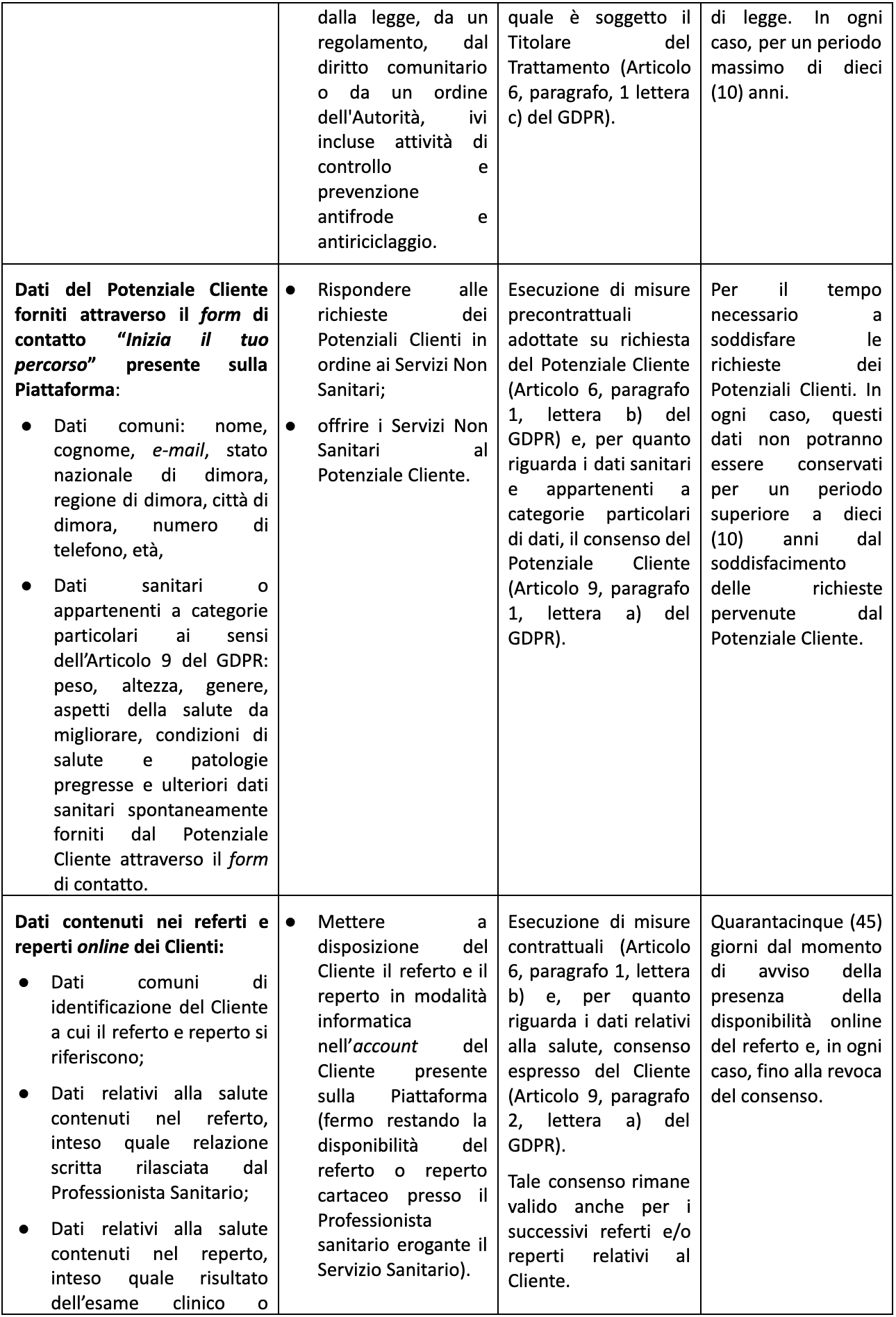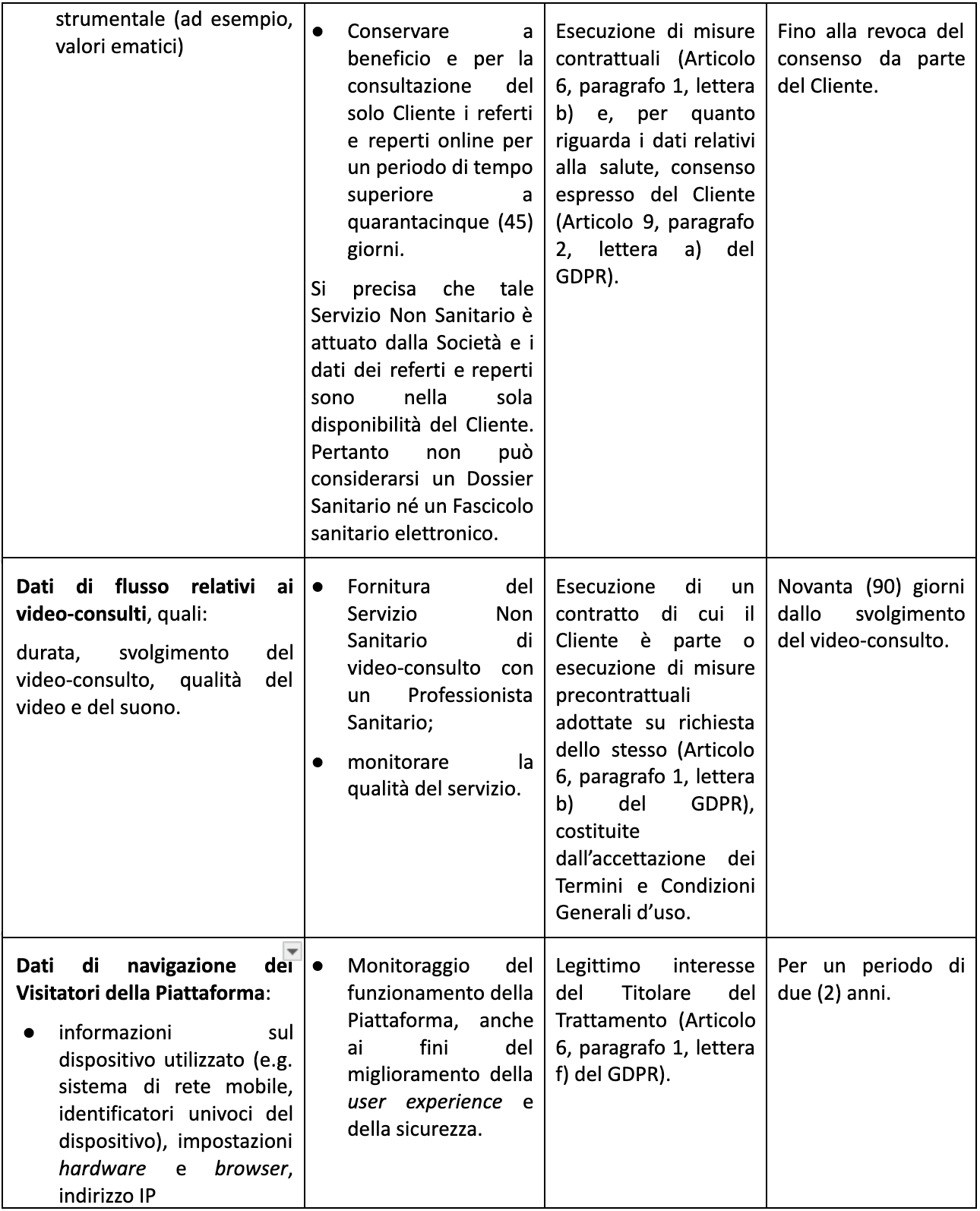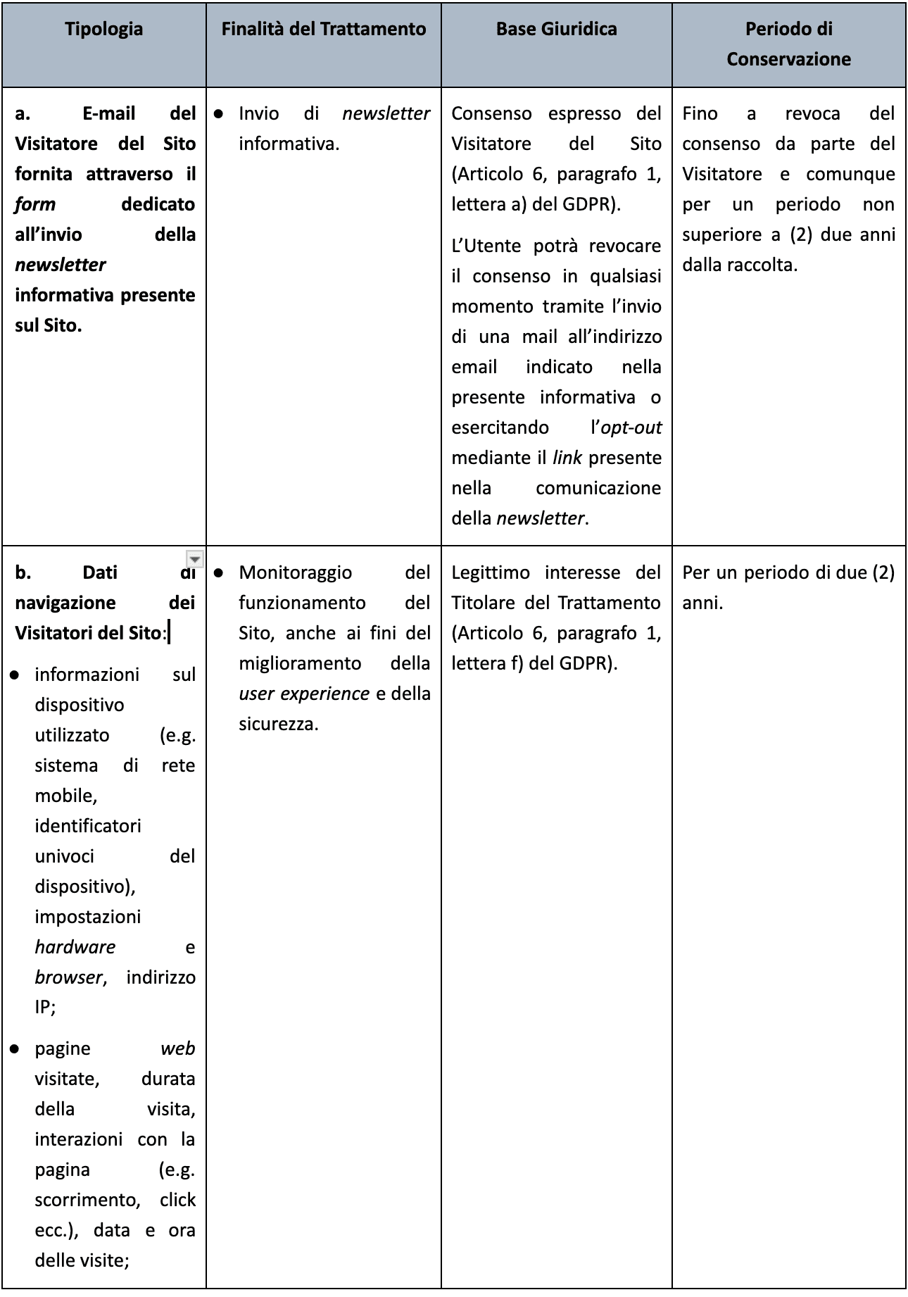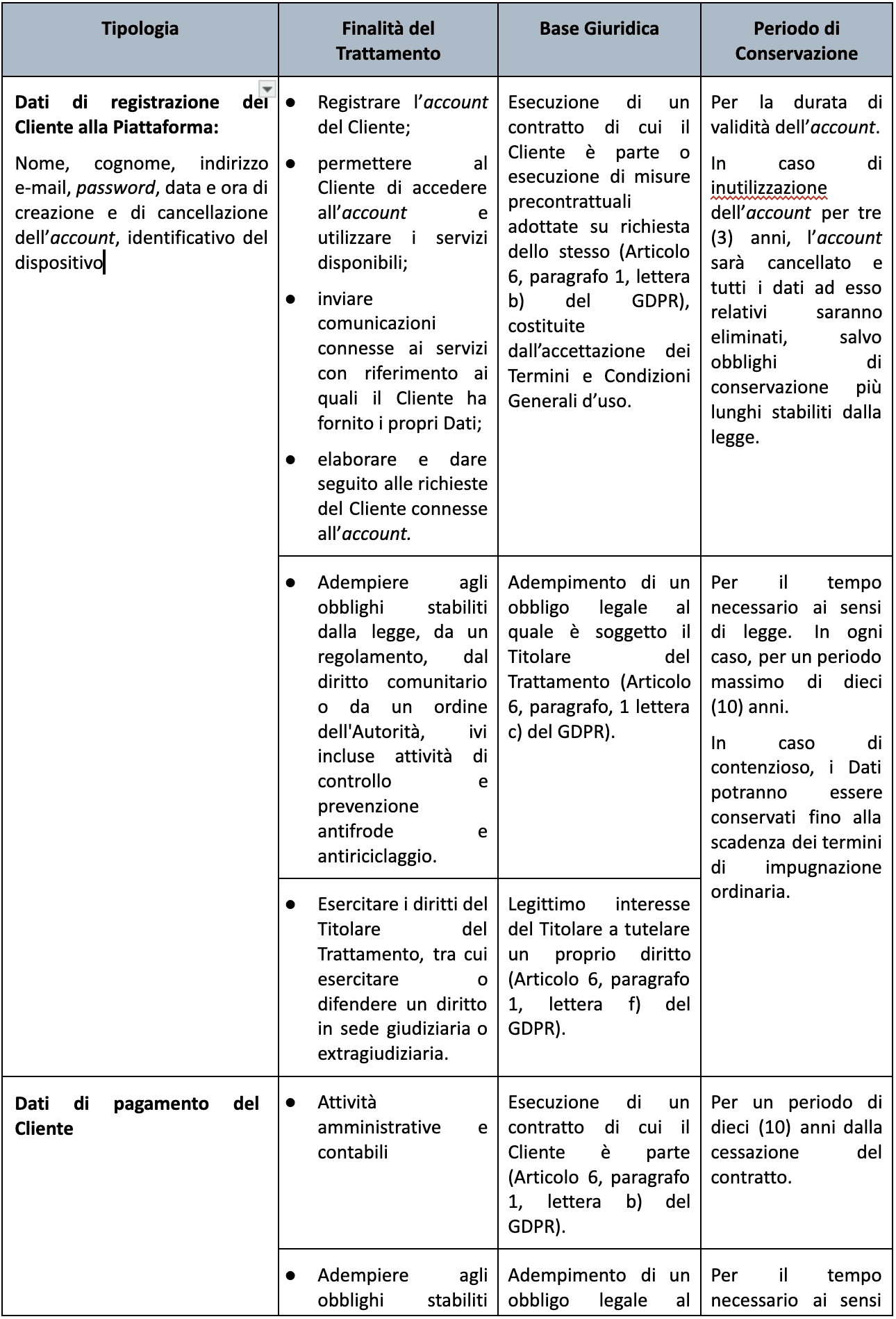 Conservazione e cancellazione dei Dati Il periodo di conservazione dei Dati Personali è indicato nella tabella al precedente punto 2.