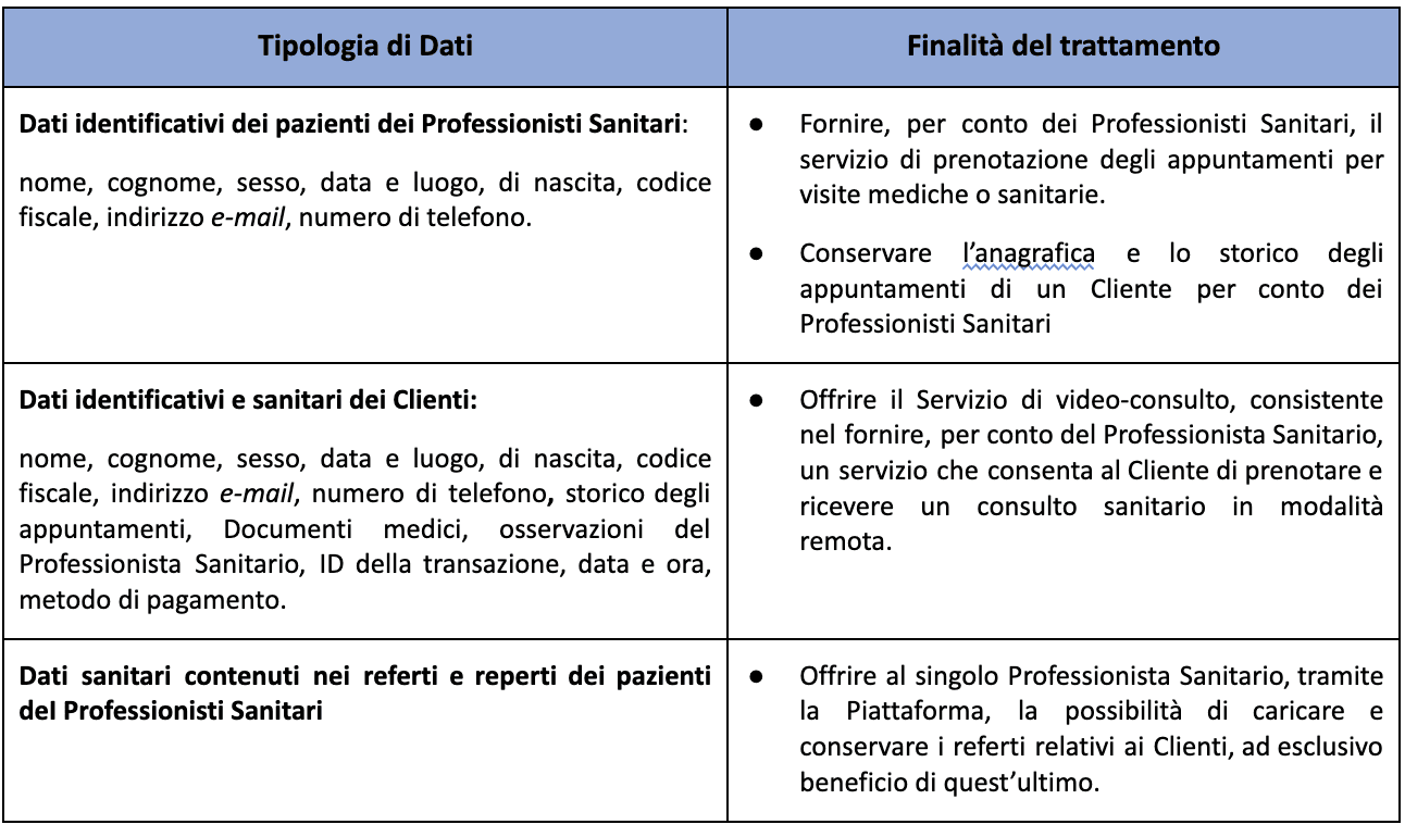 Qura potrà trattare i seguenti Dati Personali, in qualità di responsabile del trattamento, ai sensi della nomina a responsabile del trattamento sottoscritta con ciascun Professionista Sanitario, in qualità di autonomo titolare del trattamento. Per maggiori indicazioni sui termini e condizioni di tale trattamento, si prega di contattare lo specifico Professionista Sanitario e/o richiedere una copia dell’informativa sul trattamento dei dati personali e particolari con riguardo a quelli sanitari.