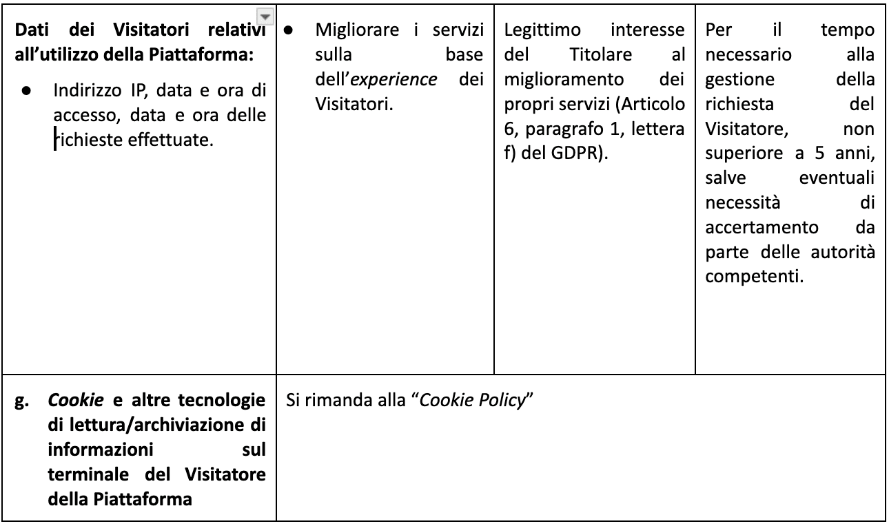 Il Titolare tratterà i Suoi Dati Personali per il conseguimento di finalità precise e solo in presenza di una specifica base giuridica. Il trattamento avrà ad oggetto singole operazioni, o un complesso di operazioni, dei seguenti dati personali forniti dall’Interessato in occasione della fruizione dei servizi resi dal Titolare del Trattamento, tramite il Sito e la Piattaforma, come descritto nella seguente tabella (i “Dati Personali” o i “Dati”):